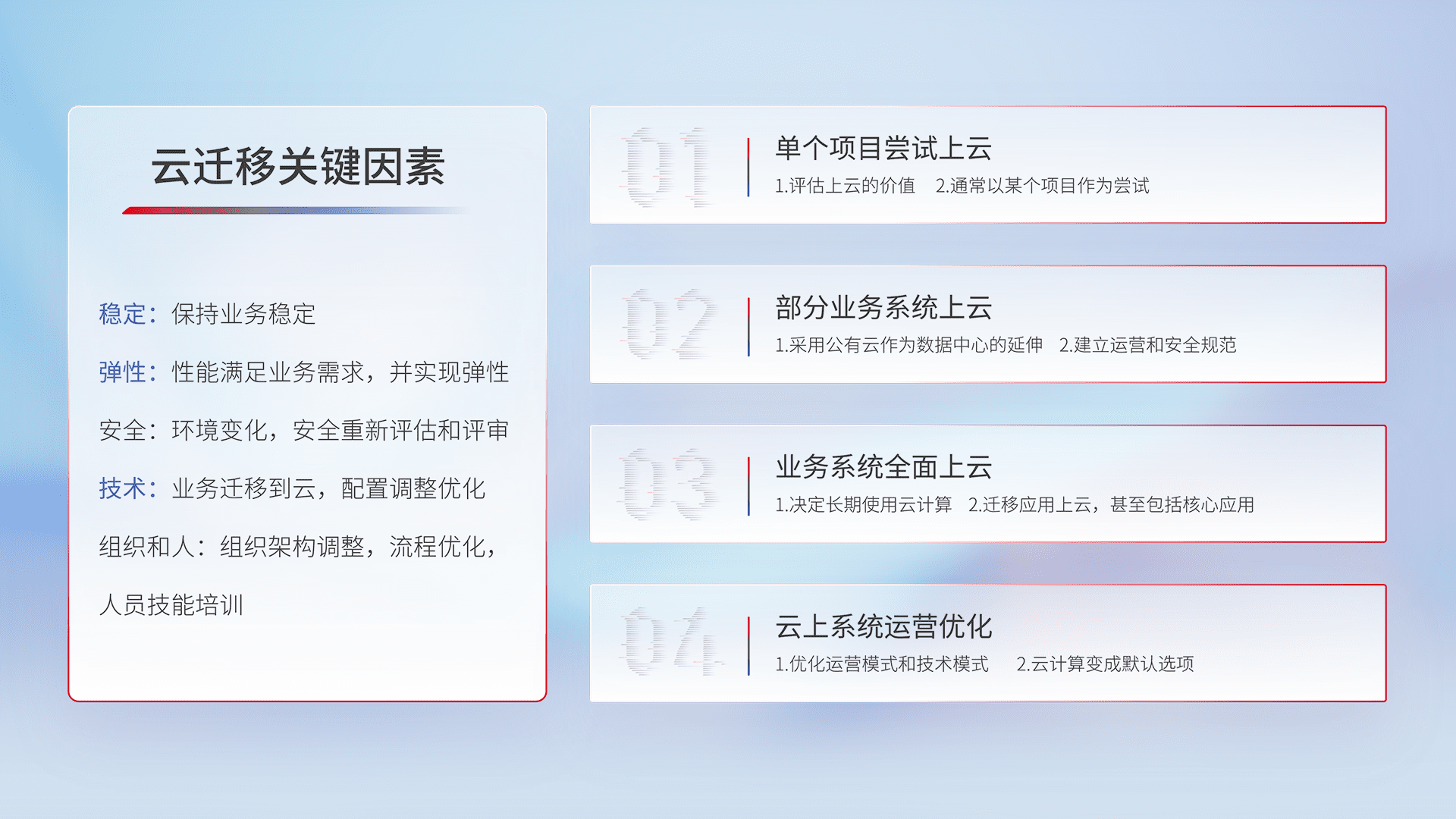 结合实际业务,,,,从规划设计、、、、云平台选型、、、云原生改造、、、数据迁移、、、集成交付,,迁移全过程为客户识别最佳上云路径,,,,做好风险识别管理,,,设计网络架构、、、、身份权限、、、、安全审计合规、、、、操作审计、、日志审计、、、、监控告警策略、、、多站点容灾设计等,,,对云上基础设施进行整体规划,,,,提升IT治理水平,,,,以满足弹性、、高可用、、、、高性能的需求。。。。