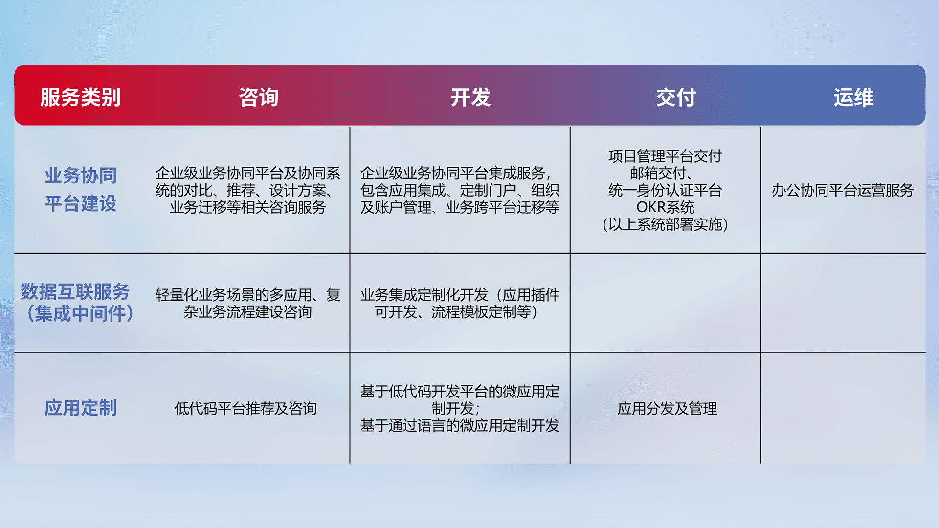 针对钉钉、、、企微、、IDaas等平台级产品提供产品的规划、、、、方案、、、、交付、、定制化开发等服务,,,,实现如统一协同办公、、、、智能客户服务、、、、混合会议管理、、、、智能数据查询、、等业务场景,,实现数字化转型。。